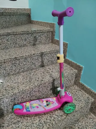 Patinete infantil de tres ruedas con diseño de unicornio. - Manillar tiene altura regulable en 5 posiciones hasta 76cm, además se pliega 90° para transportar fácilmente. - Base y ruedas en color rosa. - Ruedas delanteras verdes. - Diseño colorido con unicornio y arcoíris.