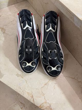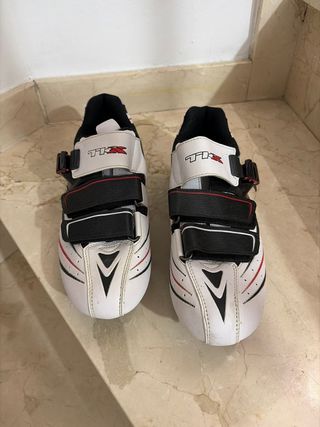 Zapatillas de ciclismo marca TKX en color blanco con detalles en negro y rojo. Cuentan con cierre de velcro para un ajuste seguro. Talla 41. - Cierre de velcro. - Diseño deportivo. - Marca: TKX.