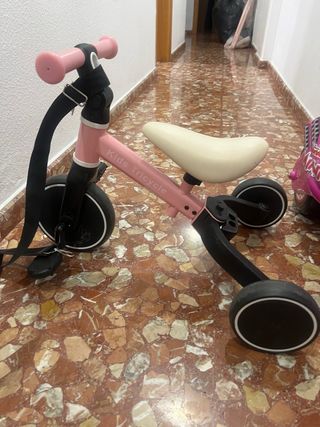 Triciclo infantil con asiento gris y detalles en rosa. - Ruedas negras. - Manillar blanco y rosa. - Reposapiés. - Empuñaduras grises. - Capota para el sol. - Agarre para ayudar al niño a conducir. - Arnés y cinturón para según que edad. - Cesta trasera y bolso. - Todo va por piezas para quitar o poner según la edad.