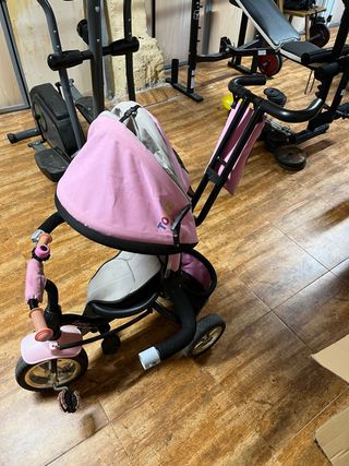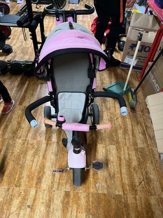 Triciclo evolutivo infantil rosa con capota y barra de empuje – Muy buen estado Se vende triciclo evolutivo para niña en color rosa y gris, ideal para acompañar el crecimiento del peque. 🩷 Características: • Capota plegable para proteger del sol • Barra trasera de empuje para que los padres puedan dirigirlo cómodamente • Cinturón de seguridad • Reposapiés • Pedales y ruedas resistentes • Barra protectora acolchada desmontable • Asiento cómodo con respaldo alto Perfecto para paseos diarios. Se puede usar primero como triciclo dirigido por adulto y más adelante como triciclo independiente. ✅ En buen estado, listo para usar.