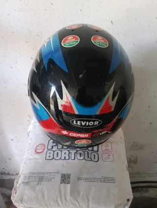 Casco de moto LEVIOR con diseño llamativo. - Visera transparente. - Adhesivos decorativos de estrellas y logos. - Cierre de seguridad.