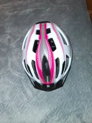 Casco de bicicleta con un diseño moderno y llamativo. - Color blanco con detalles en rosa y plateado. - Múltiples ventilaciones para mayor comodidad. - Visera protectora.