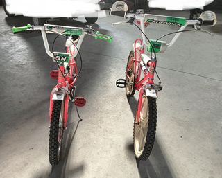 Pack 2 Bicicletas BMX BH California Star 2 en color naranja,muy buen estado pegatinas y accesorios todo de fabrica , una tiene llantas de radio y la otra de plástico más cubre manetas,Un clásico para los amantes del BMX. - Cuadro y horquilla de acero. - Manillar cromado. - Ruedas de 20 pulgadas. - Pedales de plataforma. -llantas plástico o radio . -pegatinas fabricación -precio consultar