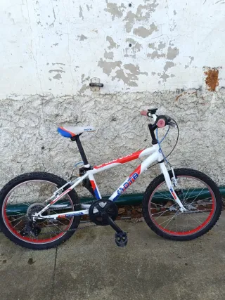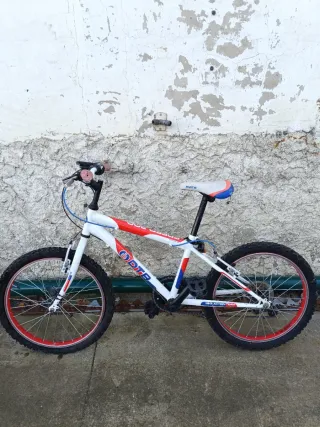 Bicicleta BTB Speed 200 con un diseño deportivo y llamativo. - 6 velocidades -Canjrejo de marchas Shimano - Cuadro blanco con detalles en rojo y azul. -Llantas rojas. -Funciona perfectamente, lo único que los colores están un poco desgastados como los puños, pero es solo estética y barato de cambiar
