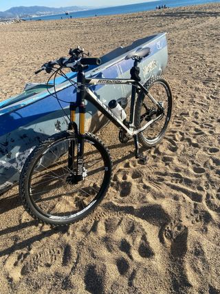 Bicicleta de montaña con doble suspensión. Poco uso. Cubiertas y pastillas de freno nuevas. Puesta a punto recientemente. - Cuadro de aluminio. - Horquilla delantera Rock Shox. - Amortiguador trasero Xfusion - Ruedas Michelin Country 26". - Frenos de disco.