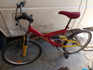 Bicicleta de montaña con suspensión delantera y trasera. - Cuadro de color rojo. - Horquilla delantera y basculante trasero de color amarillo. - Sillín de color rojo. - Ruedas de 26 pulgadas.