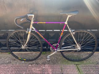 Todo es nuevo o como nuevo. Cuadro y horquilla nuevos sin uso, con los adhesivos originales de fabrica. Bielas y desviadores Shimano Arabesque. Direccion, puentes de freno y tija de sillin Shimano 600. Pedales Gipiemme Sprint, sillin Flite Milano, cinta de manillar Supacaz super Stycki, manillar y potencia 3ttt, ruedas Mavic MA40 con bujes shimano 105, timbre rockbros clasico...... Es preciosa y como nueva.