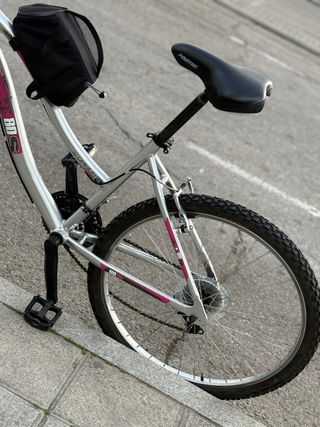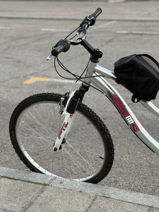 Bicicleta de montaña con un diseño moderno y funcional. De Aluminio Rin 26” PRECIO NEGOCIABLE - Cuadro de color plateado con detalles en rosa. - Manillar negro con puños texturizados. - Bolsa negra para el cuadro. - Rueda delantera con horquilla blanca y detalles en rosa.