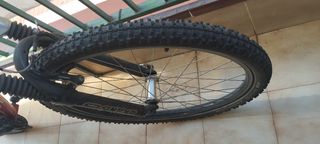 Bicicleta de montaña con horquilla delantera. Le falta neumático en la rueda trasera