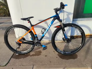 Bicicleta de montaña Giant XTC Advanced talla M - Cuadro de carbono. - Ruedas de 29 pulgadas. - Frenos de disco Shimano XT, 180 delante 160 detrás. - Horquilla delantera Rockshock recon con bloqueo - Cambios 2x11 trasero Shimano XT, desviador delantero Shimano SLX - Bielas Shimano XT - Neumáticos tubeless MSC tires tractor 29 2.2 delante y wtb vigilante 2.3 detrás - Eje pasante - En muy buen estado - Desperfectos de pintura desconchones en la zona opuesta al cambio trasero (última foto)