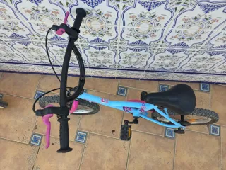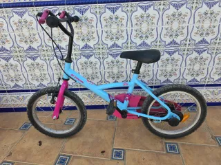 Bicicleta infantil de la marca Btwin, ideal para los más pequeños. Su diseño combina colores alegres y llamativos. - Color principal: azul. - Detalles en color rosa en puños y horquilla. - Ruedas de 16 pulgadas.