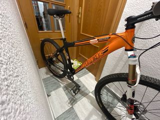 Bicicleta de montaña Trek con un llamativo diseño en color naranja y negro. Ideal para disfrutar de rutas y senderos. Grupo deore, maneta de cambio XT, manillar y potencia onoff light, monoplato de 9 velocidades, 26 pulgadas, super ligera y preparada para competir - Cuadro de aluminio ultralight competition - Horquilla de suspensión delantera Fox 32 factory - Frenos de disco DEORE hidráulicos nuevos