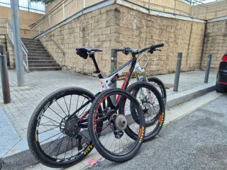 Bicicleta de montaña Scott Genius 720 talla M en buen estado. Del 2015, se compró nueva por 3.500 euros. 12,5 kg, cuadro de carbono, doble suspensión de 3 posiciones con mando de bloqueo en el manillar, horquilla de 150mm, monoplato, tija telescópica, ruedas tubeless 27,5. Está en muy buen estado, solo tiene un par de picaditas en la pintura del cuadro como se ve en la foto y marcas de desgaste típicas del uso. Se puede probar sin compromiso.