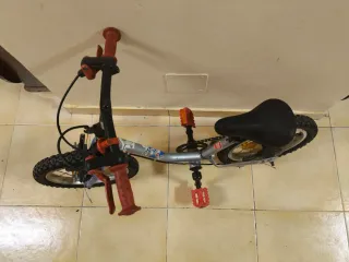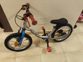 Bicicleta infantil de la marca B-Twin, ideal para los más pequeños. - Cuadro plateado y horquilla azul. - Puños y pedales en color rojo. - Ruedas con banda de rodadura. - Reflectantes en las ruedas y pedales.