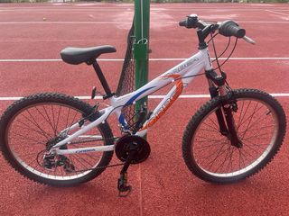 Bicicleta infantil de aluminio Conor 440 con ruedas de 24", con transmisión de 7 velocidades, frenos V-Brake y horquilla de suspensión. Comprada en 2022. Se vende por falta de uso. Cuadro de Aluminio 6061 de 24". Suspensión Delantera Zoom CH-327E, recorrido 40mm. Plato con protección. Frenos v-brake aluminio. Cubiertas de serie.