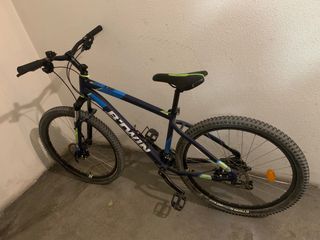 "MTB Rockrider 9.1. Talla M. Perfecta para terrenos exigentes y rutas de montaña. Características destacadas: • Cuadro: Aluminio 6061, ligero, con doble suspensión. • Suspensión delantera: Horquilla Rock Shox Recon 351 U-Turn, recorrido ajustable de 85-130 mm. • Suspensión trasera: Amortiguador Rock Shox Bar, ajustable. • Transmisión: Shimano XT de 27 velocidades (3 platos y 9 piñones). • Frenos: Frenos de disco hidráulicos Avid Juicy 3. • Ruedas: Llantas de aluminio de doble pared con neumáticos de montaña de 26"×2,15". • Peso: Aprox 13 kg. • Extras: Pedales mixtos para el uso de calas. Cuéntame, guardabarros, etc