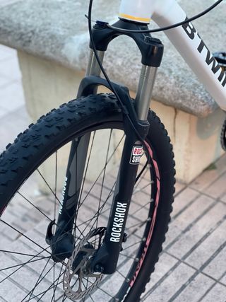 Bicicleta MTB B’TWIN rockrider 580 — revisada, lista para usar Bicicleta de montaña en muy buen estado técnico, totalmente revisada. ⬇️⬇️⬇️ -Cuadro: aluminio -Ruedas: 27.5 -Horquilla: RockShox XC30 Air -Frenos: hidráulicos, pastillas nuevas -Plato delantero nuevo -Neumáticos Michelin con muy buen agarre -Manillar y puños nuevos -Peso: aproximadamente 12-13 kilos ⬆️⬆️⬆️ Buen estado mecánico. Tiene arañazos estéticos en el cuadro y ligera oxidación en la horquilla, solo estética. Actualmente sin desviador delantero, puedo volver a montarlo si se desea. Lista para usar.