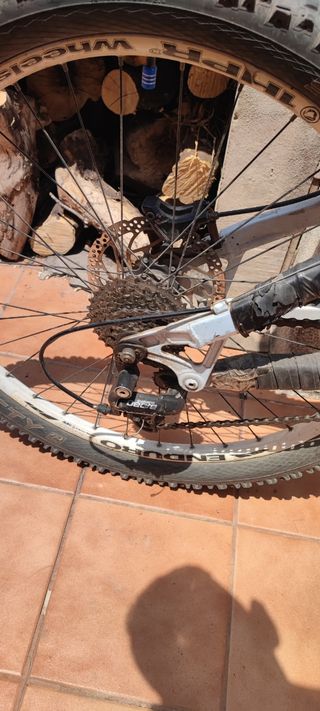 vendo esta bici de descenso,recorrido trasero 210mm con el amortiguador de 222mm que lleva Fox van r,horquilla marzocchi bomber 66 180mm de recorrido, frenos y cambio trasero Shimano deore ,sillín massi llanta delantera de 20mm mavic 321 y trasera 1hpr enduro ambas de 26" neumático delantero bien,trasero con poca vida,lleva 4 años parada en el trastero,hay que hacerle una revisión y mantenimiento,se puede ver y probar acepto cambio por algo de mi interés