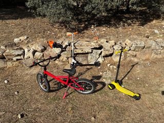 Pack completo (negociable no divisible) para los más pequeños, ideal para iniciarse en el deporte y la movilidad. - Bicicleta roja (monomarcha y frenos infantiles) - Casco naranja (ajustable y homologado) - Patinete 3 ruedas (con luces que funcionan sin pilas) - Patinete 2 ruedas (plegable de aluminio)