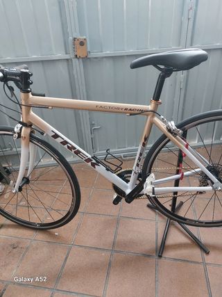Bicicleta de carretera Trek con un diseño elegante. - Cuadro de aluminio ligero. - Componentes de alta calidad. - Ruedas de carretera. - Color dorado y blanco.