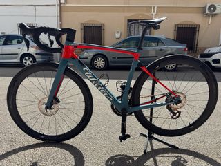 Bicicleta de carretera Wilier Cento10NDR talla S con un diseño moderno y aerodinámico. - Cuadro de carbono. - Frenos de disco. - Transmisión Shimano. - Ruedas de perfil. - Cambio electrónico cargable desde manillar. Estado impecable. Único propietario.