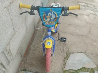 Bicicleta para niños con diseño de Sonic. - Manillar amarillo con puños. - Freno delantero. - Rueda delantera rosa. Sillín con un poco de roto pero se le podrá poner una funda
