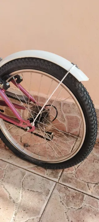 Bicicleta infantil de color rosa, ideal para niñas. - Cesta delantera morada. - Guardabarros delantero y trasero blancos. - Ruedas de 20 pulgadas.