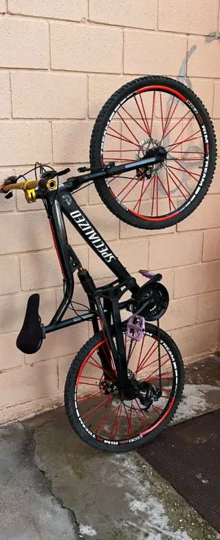Bicicleta de montaña con suspensión delantera y trasera. Lista para tus aventuras. - Cuadro de aluminio. - Ruedas de 26 pulgadas. - Frenos de disco. - Pedales de plataforma.