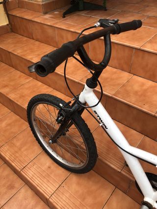Bicicleta infantil de la marca BTWIN en color blanco. Ideal para los más pequeños. Tiene algunos defectos del uso. - Ruedas de 20 pulgadas. - Frenos delanteros y traseros. - Sillín ajustable.