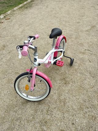 Bicicleta infantil comprada en Decatlón con un diseño divertido y colorido. - Color blanco con detalles en rosa. - Ruedines de apoyo incluidos. - Cadena protegida con cubre cadena. - Guardabarros delantero y trasero. Está prácticamente nueva, a mi hija la da miedo y no la ha dado uso.