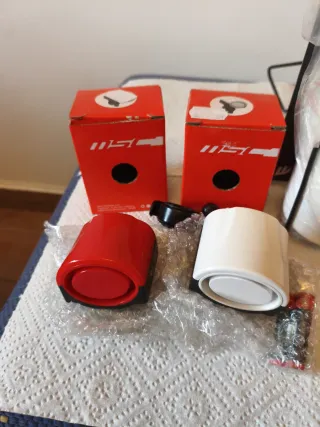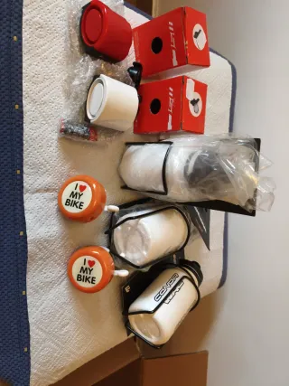 Lote de accesorios para bicicleta. - Dos timbres de bicicleta con diseño I Love My Bike. - 3 bidones de agua para bicicleta. - Un timbre rojo y otro blanco eléctricos, incluye pilas
