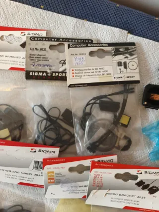 Conjunto de accesorios para ciclocomputadores Sigma. -4 ud inhalación con soportes para manillar mod 2032 - 2 ud instalación cables de conexión para mod bc 1600 -1 ud sensor de velocidad30€ -4 ud imanes para radio redondo y plano. - Otros componentes varios.