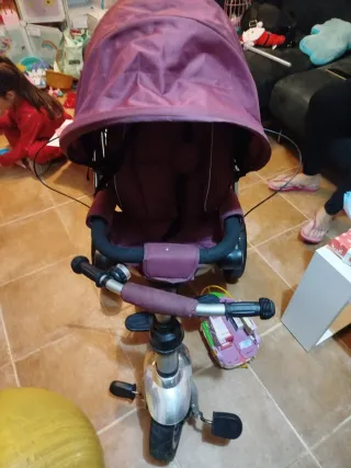 Triciclo versátil que se adapta a las necesidades de los más pequeños. - Diseño 2 en 1. - Capota para proteger del sol. - Cesta de almacenamiento. - Barra de empuje. - Reposapiés. Triciclo evolutivo con poco uso. Se puede usar como carro de bebe y también como triciclo. Se plega fácilmente. Le falta un tornillo pero no impide su uso . El tornillo se puede reemplazar. El triciclo hay que recogerlo en domicilio dado que su tamaño es grande o lo puedo acercar si está alrededor de Illescas.