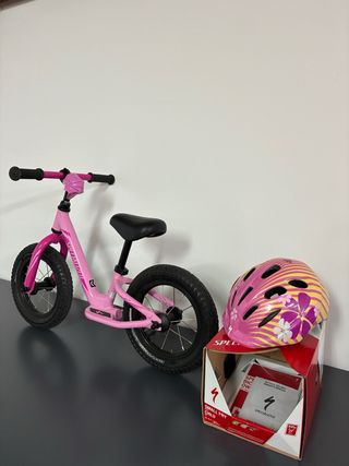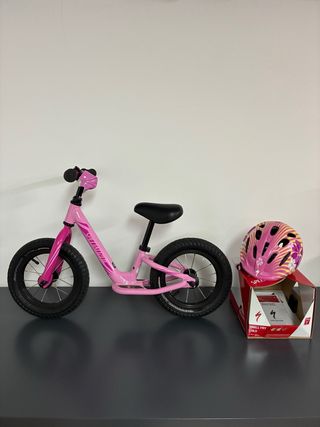 Bicicleta de aprendizaje Specialized Hotwalk en color rosa. PRECIO DE COMPRA 170 euros - Marco de aluminio ligero. - Ruedas de 12 pulgadas. - Sillín ajustable en altura. - Puños de goma para un mejor agarre. CASCO PRECIO COMPRA 55 euros ( VENDO POR 20 euros )