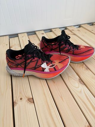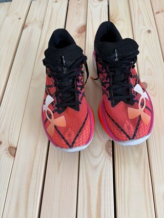 Zapatillas de running Under Armour velociti elite 2 con placa de carbono T42. - Diseño en color naranja y negro. - Logo de Under Armour en blanco y naranja. - Cierre con cordones negros. Precio nuevas 175€