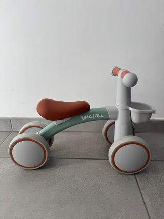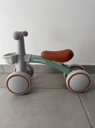 Bicicleta de equilibrio Umatoll para los más pequeños. Diseñada para fomentar el desarrollo de la motricidad y el equilibrio. - Color principal gris y verde menta. - Asiento de color marrón. - Ruedas con detalles en naranja. - Incluye una pequeña cesta delantera.