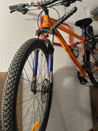 Bicicleta de montaña Decathlon en color naranja. - Cuadro de aluminio. - Horquilla delantera con suspensión. - Ruedas de 26 pulgadas. - Frenos V-brake.