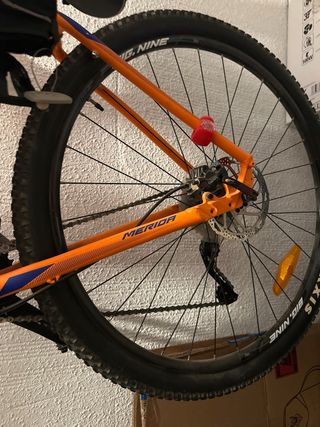 Bicicleta Mérida de montaña con un llamativo color naranja. - Cuadro de aluminio. - Horquilla RockShox. - Frenos de disco.