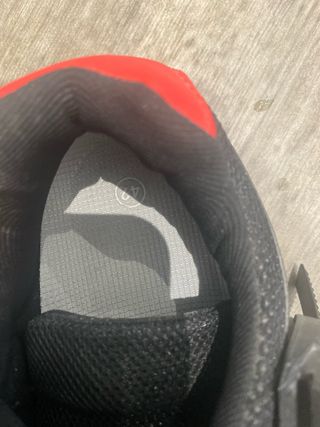 Zapatillas de ciclismo en color negro con detalles en rojo. Cierre de velcro y hebilla. - Talla 42. - Diseño deportivo. - Suela reforzada.