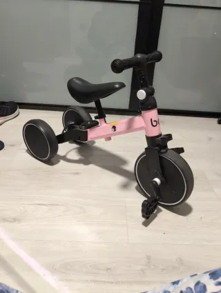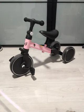 Triciclo infantil convertible en tres modos, ideal para acompañar el crecimiento. - Diseño en color rosa con detalles negros. - Estructura resistente y segura. - Ruedas negras con borde blanco. En verdad mi hija casi no lo ha usado.. tiene un arañazo en el manillar que se aprecia en la foto, por haberlo transportado...