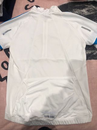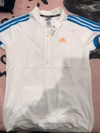 Camiseta de ciclismo Adidas de manga corta en color blanco. Diseñada para la práctica deportiva. - Logo de Adidas en naranja. - Rayas azules en las mangas. - Cremallera frontal. - Cuello alto.