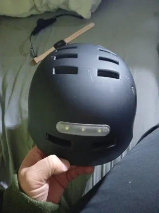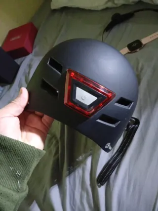 Casco negro para patinete con luz trasera integrada. - Diseño moderno y ventilado. - Luz LED roja para mayor visibilidad. - Correa ajustable para un ajuste seguro.
