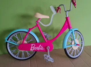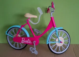 Bicicleta de juguete con diseño de Barbie. - Color principal: rosa. - Detalles en color azul. - Incluye asiento y manillar. - Ruedas plateadas.