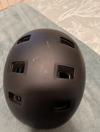 Casco de protección B'Twin en color negro, diseñado para niños. - Diseño con ventilación. - Correa ajustable con cierre. Tiene algún roce de estar en el armario porque se ha usado 2 veces. Interior intacto, 0 golpes recibidos.