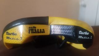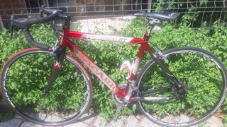 bicicleta de aluminio con horquilla, tirantes y tija de carbono. Montada en campagnolo. Manillar de aliminio Dedda. Potencia de aluminio Tioga Dirección FSA. Sillín San Marco. Ruedas Mavic Askium. 9V. Muy ligera. Talla 48.