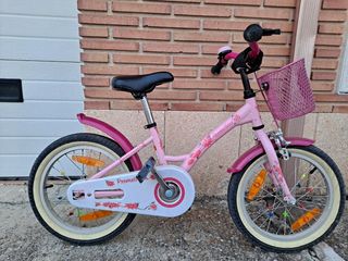 Bicicleta infantil en buen estado, ideal para niñas de entre 4 y 7 años. - Color blanco con detalles rosas. - Incluye ruedines. - Cesta delantera.