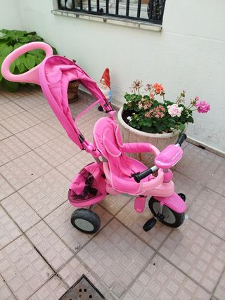 Preciosa bicicleta infantil de la marca Juguetos, en color rosa. Es perfecta para que los más pequeños empiecen a disfrutar de sus primeros paseos. - Incluye capota para proteger del sol. - Dispone de cesta portaobjetos. - Asiento acolchado para mayor comodidad. - Estructura resistente y ligera.