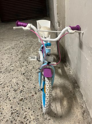Bicicleta infantil de 14 pulgadas con temática de Frozen. Ideal para los más pequeños. - Diseño en color azul y morado. - Asiento trasero para muñecos. - Ruedines incluidos.