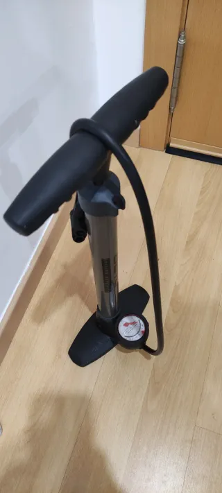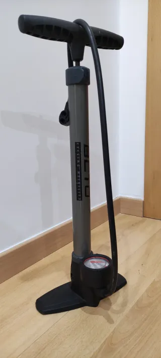 Bomba de pie para hinchar neumáticos de bicicleta. Cuenta con un manómetro integrado para controlar la presión. Manómetro 11 bares (160 psi) - Diseño robusto y estable. - Manguera flexible. - Empuñadura ergonómica.