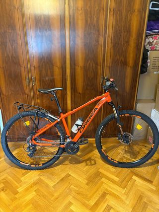 Bicicleta Orbea de montaña en color naranja, con ruedas de 29 pulgadas. Se encuentra en excelente estado. - Cuadro de aluminio. - Frenos de disco. - Suspensión delantera. - Portabultos trasero.